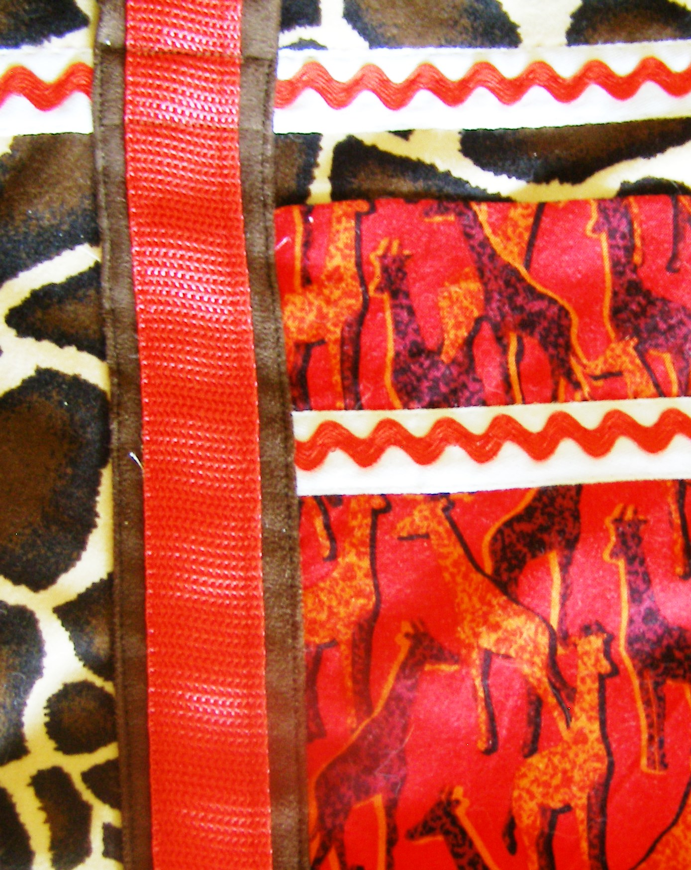 In the Giraffe Market Bag shown to the left, one giraffe print was used for the bag and a different giraffe print for the pocket.  The base and the handles were made of dark brown microsuede.  The microsuede handles seemed to stretch, so the purchase (again, the “P” word!!!) of the red nylon webbing became necessary.