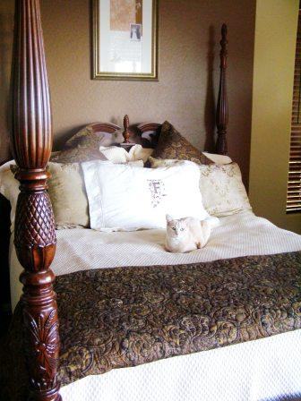 The photo shows it on the foot of the bed – which is where it was intended for. There is coordinating wall paper in the en suite bath.