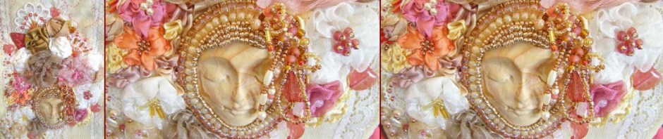 The embellishments add that Stash Couture touch – and are just soooo much fun to create!!! The Goddess cabochon is polymer clay. The larger flowers, leaves, and roses were constructed as detailed in the tutorials. Silk ribbon details provided color and fill.