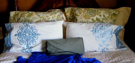 One of the advantages of using a tablecloth for the Euro Shams is that it is 60″ wide.  The pillows could be  cut to 30″ squares side by side.  A 54″ fabric is too narrow to do so, requiring extra yardage.