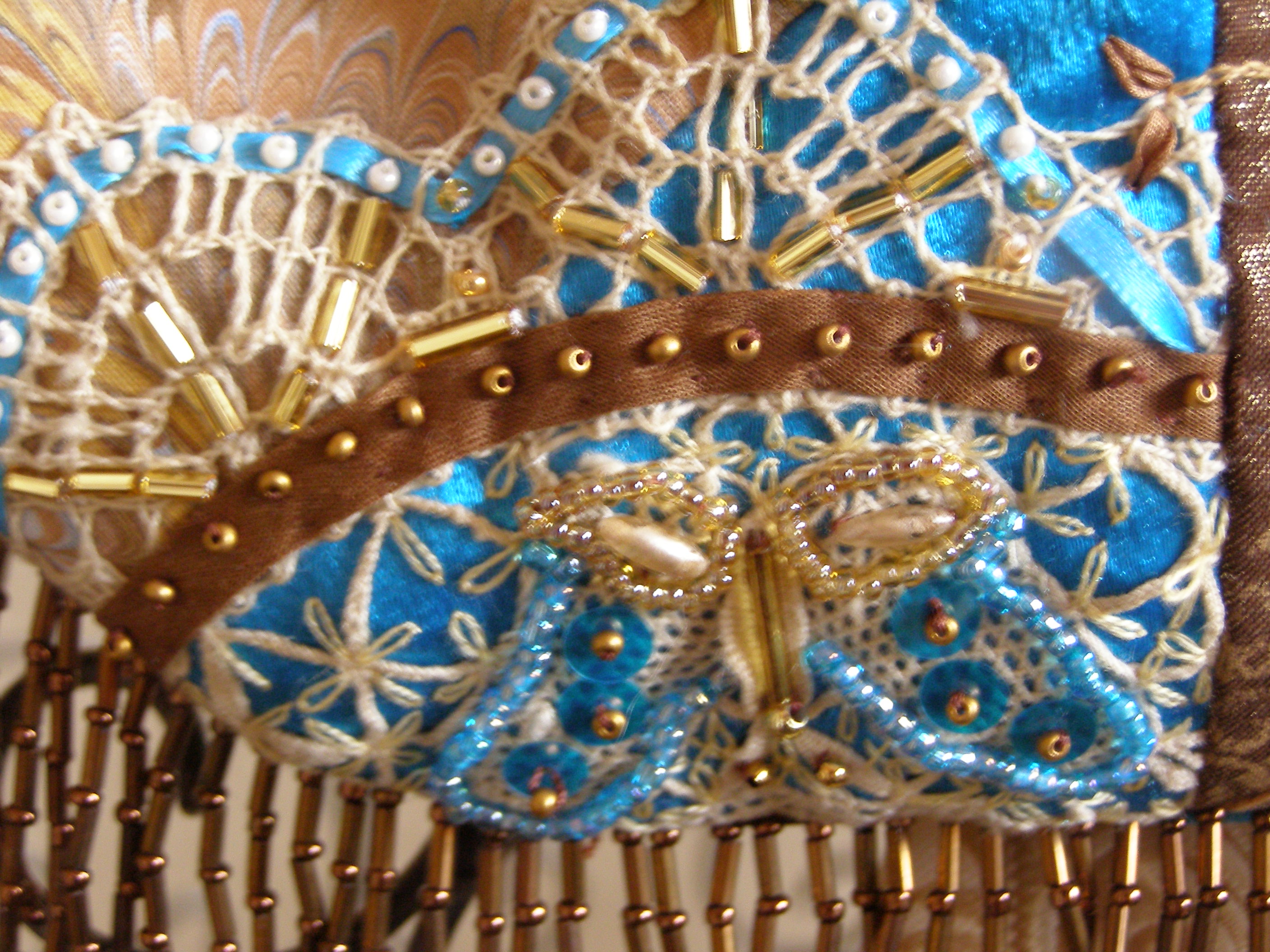 The other side of the bag includes a beautiful piece of old lace embellished with silk ribbons, butterfly beads and Stash buttons.