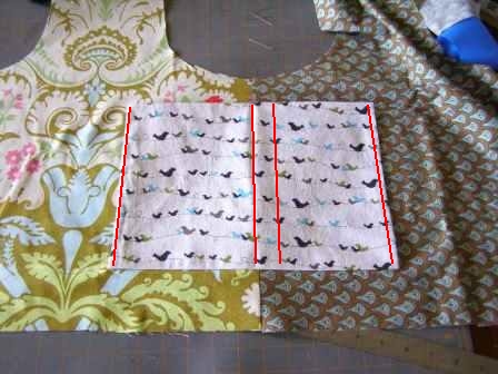Place a pin at each of the red dots. The pins should be placed in the lining, 1/2″ from the lower edge of the pocket.