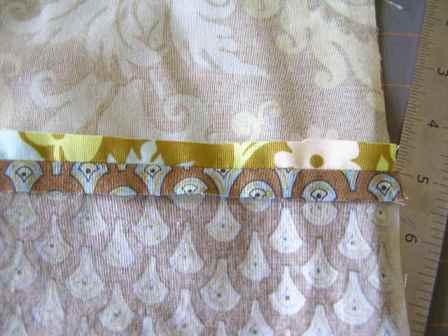 Place pocket on RIGHT SIDE of Linings, so that upper folded edge is approx. 1.5″ from top edge of lining and pressed centerline of pocket is aligned with the side seam – as shown in Photo 8.