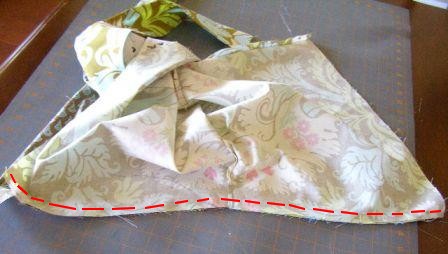 Place the lining on top of the outside pieces – RIGHT SIDES together – and pin together. Sew together along the red dashed lines as shown in Photo 14.