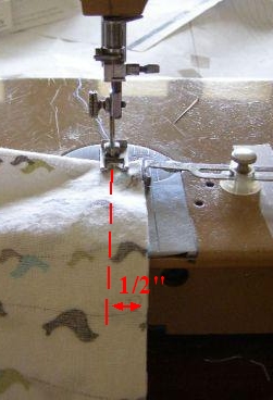 Photo 3 illustrates a 1/2″ seam allowance. The 1/2″ is measured between the stitching and the cut edge of the fabric. Most sewing machines will have a tool such as the “arm” looking device that is screwed into the sewing machine that assists keeping a nice even seam allowance.