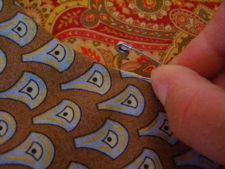 Pick up the lower left corner- just the top layer. Pick up the lower right corner- just the top layer. Pin them together – right sides together. Move up the seam to the next X and pin again. Move up 2 more inches and pin again. Move up 2 more inches and pin again. Continue pinning every 2″. Eventually, the paper will fall out and the linings will start to be the fabric you are pining together.