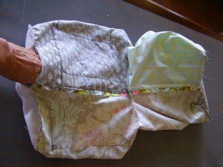 Reach hand through unsewn opening in the lining base seam.  Grasp the outer bag base and turn the bag right side out as shown in Photo 12.