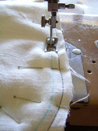 Pin the layers together.  To secure the “sandwich”, sew the layers together halfway between the line and the edge of the fabric.
