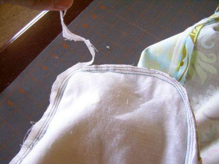 Then trim the sewn sections of the seam. Trimming is to cut away about 1/4″ from the seam that you just sewed as shown in Photo 11.  Curved seams will fit together – clipping and trimming help!