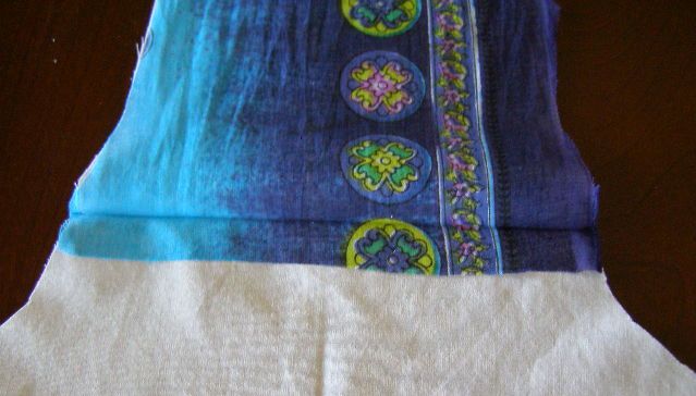 The bohemian look of the bag would not have been achieved if I had used fabric from The Stash for the bag, so I used a scarf for the main fabric.  Another option would have been to use those block print dorm room bedspreads from “back in the day”.
