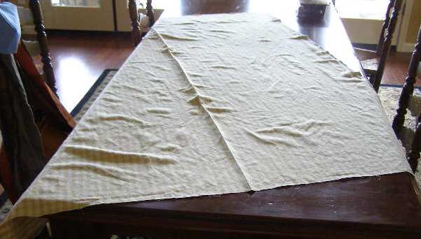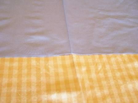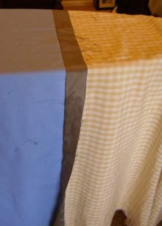The fabric used here was a 55″ wide tablecloth check (1/2″ wide) in a medium weight polyester. The beige on white check has limited contrast – which will not show through most fabrics.