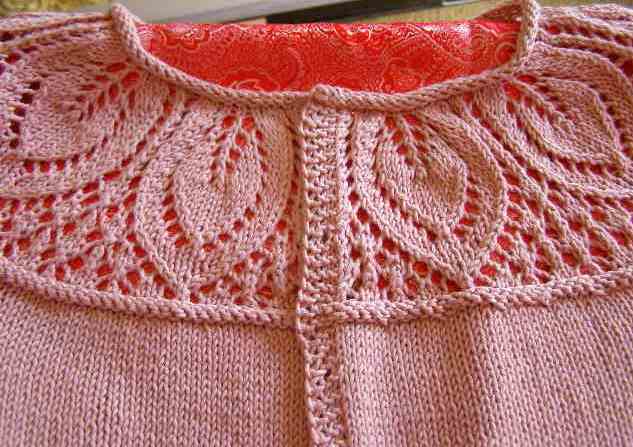 The original pattern (left) was not a cardigan and did not have sleeves – but in top-down knitting that is not a difficult modification.