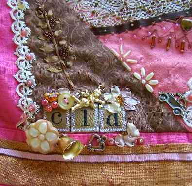 The center back panel was crazy quilted and heavily embellished. The lower right back waistband has the seven hearts.