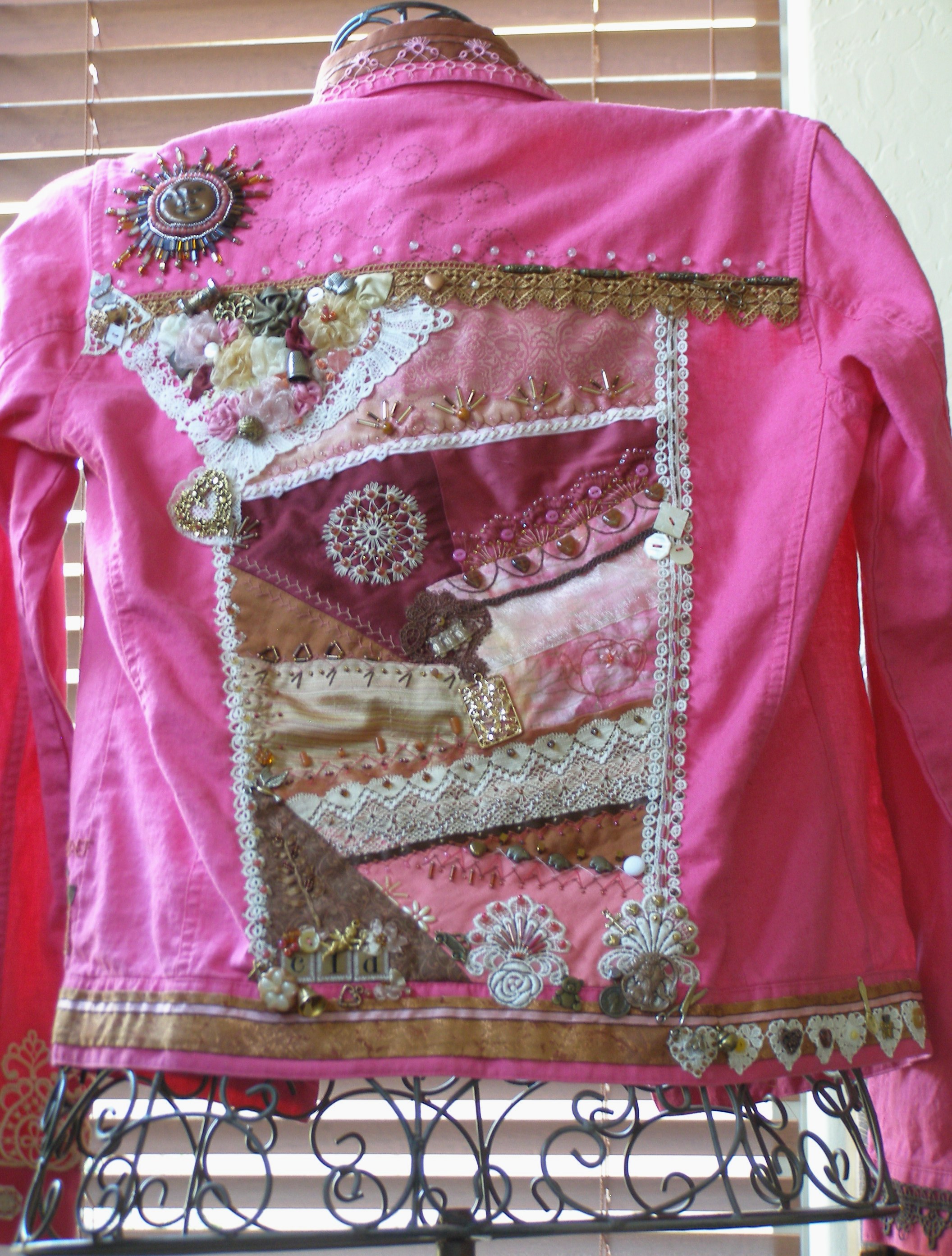 Panels below the front jacket pockets were also crazy quilted and embellished. Individual lace motifs were placed on the buttonholes. Vintage buttons replaced the original plain pink buttons.