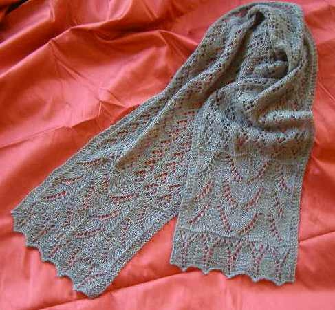 As all knitters know, the more beautiful the yarn, the more difficult pattern selection becomes! Throughout the four years that transpired between beading and completion, 5 different scarf patterns were started – and stopped – and unraveled – and restarted….There was even one ill-fated attempt at developing my own pattern.