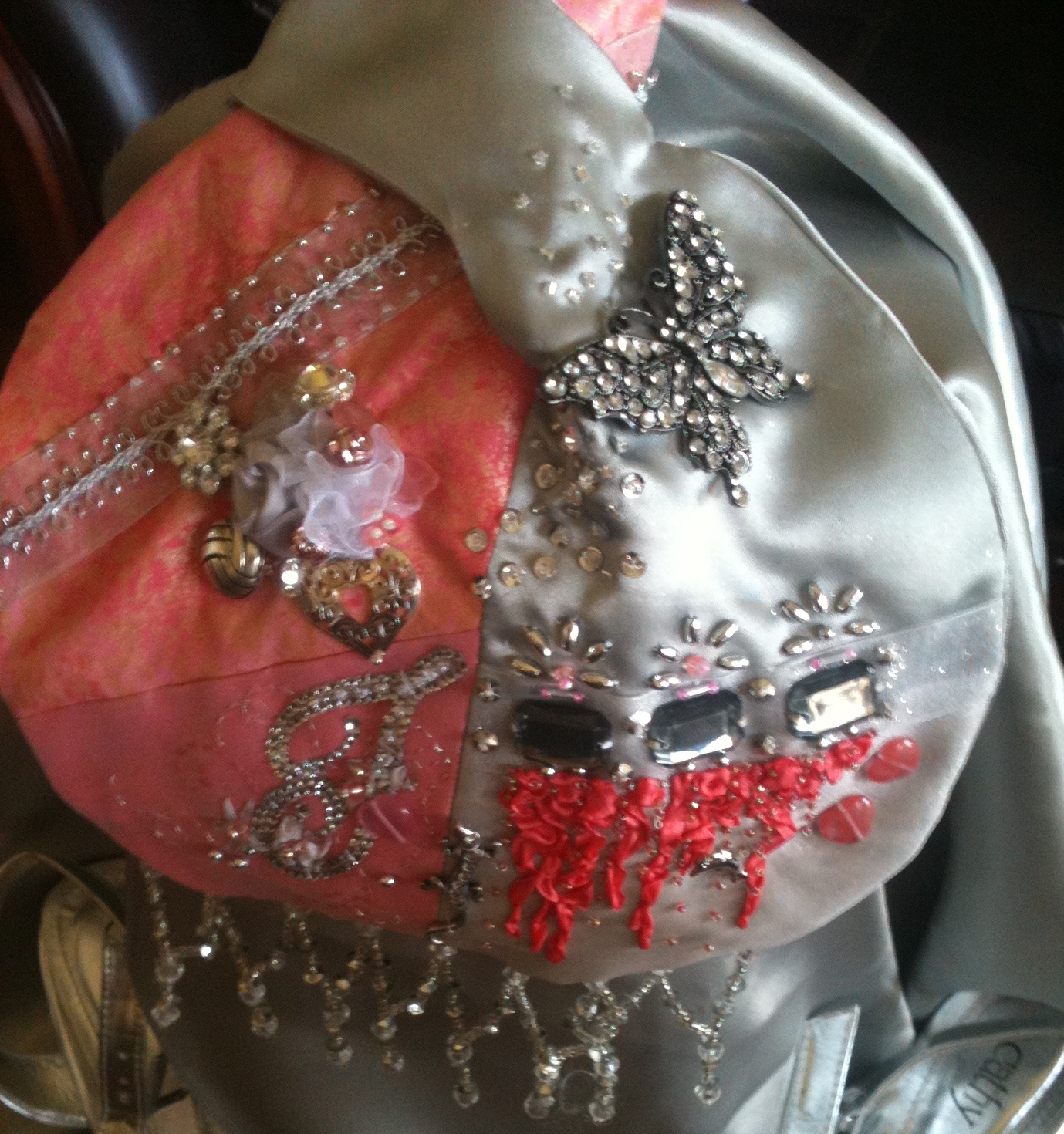 The Prom Dress was beyond beautiful. A skirt of cascading rows of coral chiffon, and a bodice with heavy rhinestone and “jeweled” embellishments!