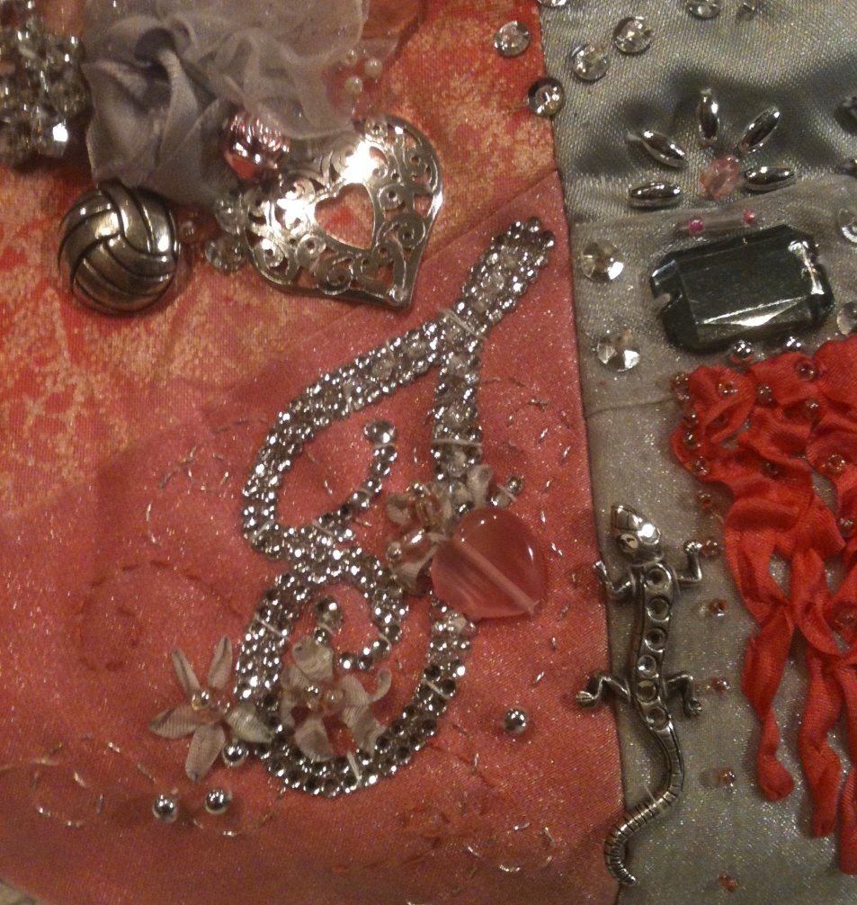 The monogram “F” was self-sticking, which would have been a nice time saver, but as it required infilling with extra beads, it was stitched as well. (FYI: removing Sticky Stuff from beading needles requires too much time!).