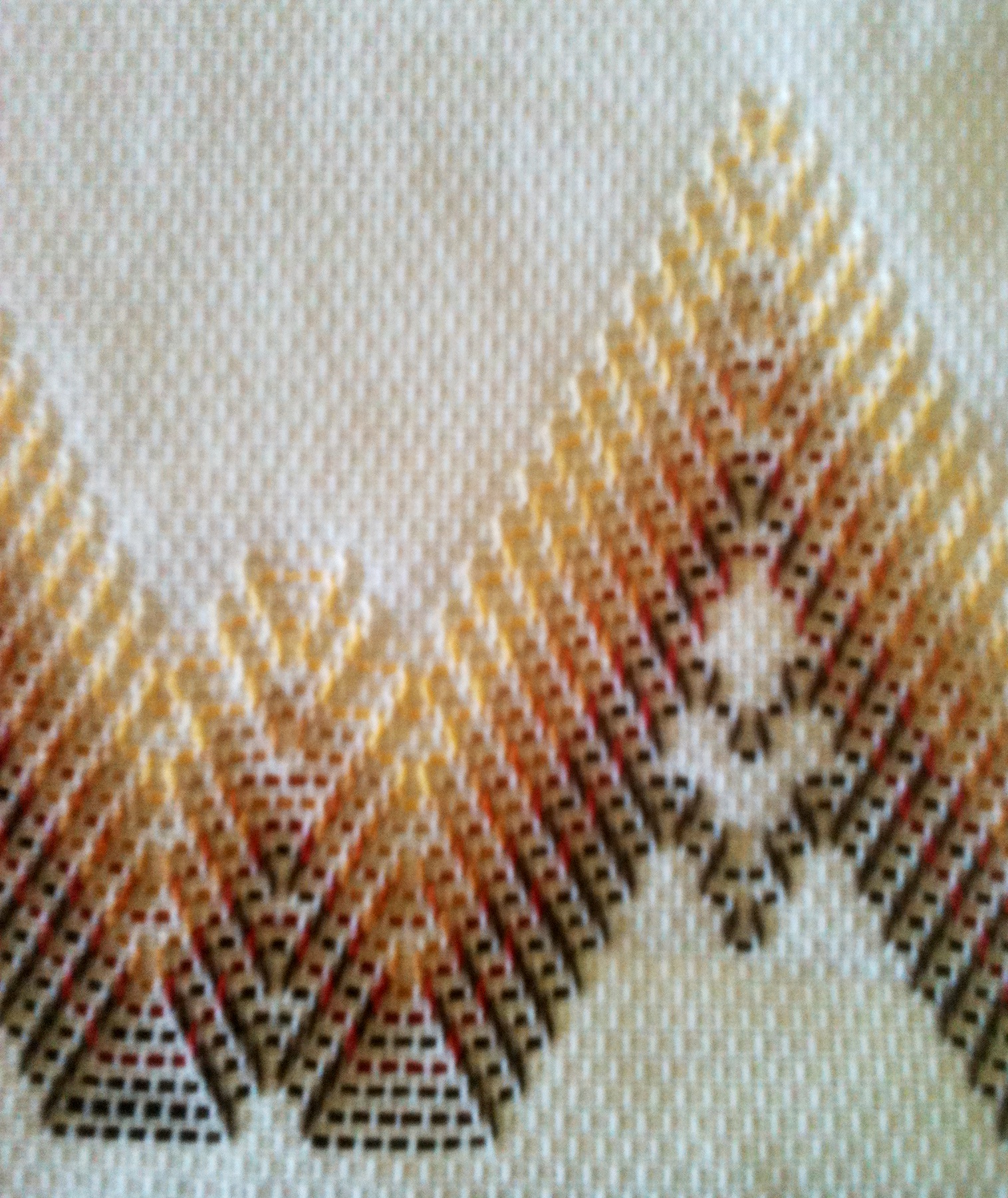 Cotton Huck Toweling has these raised threads. One side has vertical raised threads – the opposite side has horizontal raised threads. The above design was stitched through vertical threads.