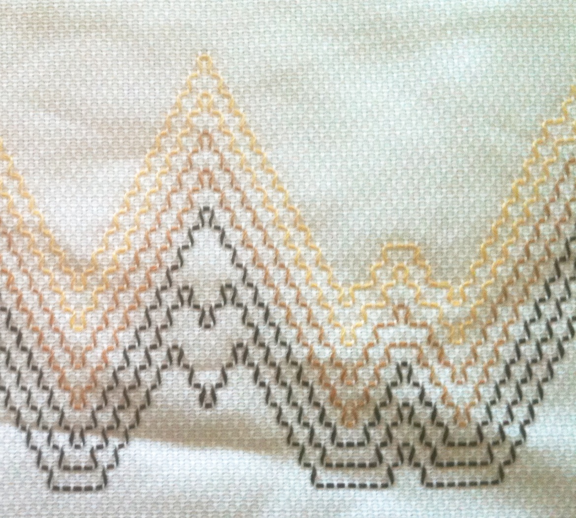 While Huck Embroidery in a single thread color is beautiful, part of the fun of Huck Towel Embroidery is the interplay of the tread colors. As illustrated in the Waves with Lace Edge Design Detail, color gradations look very different in the longer vertical stitches than in the shorter horizontal ones.