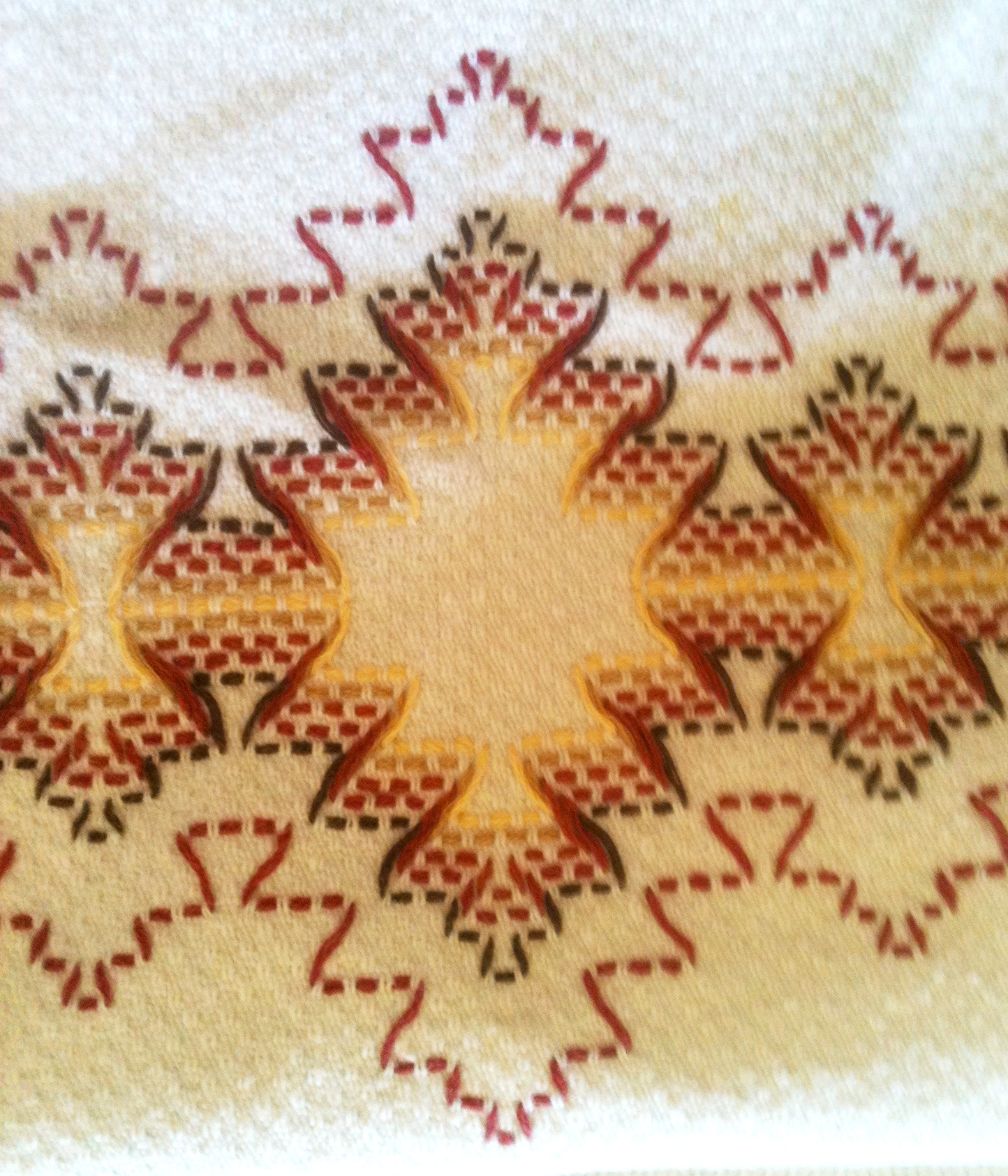 A towel made several years ago serves as a pattern.  Its design is quite simple and will be used here.  The yellow threads in the center will be the starting threads.