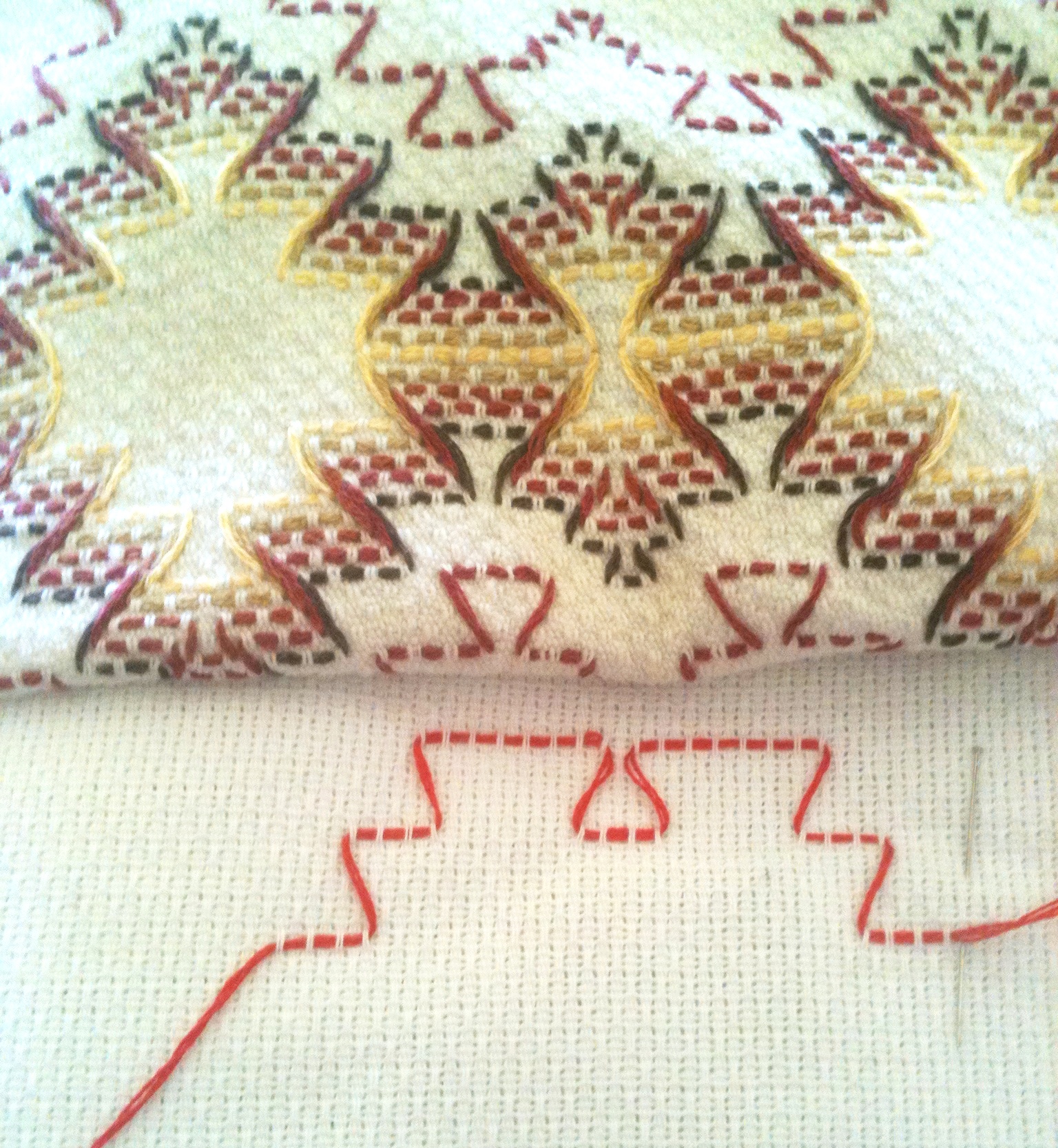 Using red thread, a practice Row 1 was completed and compared to the original design (lower yellow row) to determine if revisions were needed.