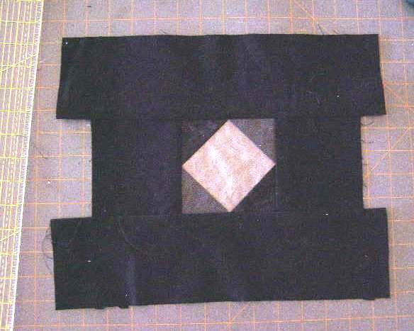 Place the square with the two border pieces wrong side (paper side) up on the rotary cutting board.