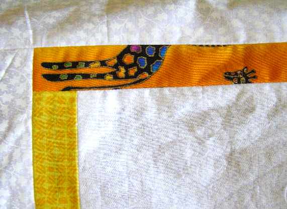 The original jelly roll fabrics were brightened by contrasting fabrics from The Stash. The green and orange in the lower stripe is a Marimekko Giraffe. There is also a very small section of Laurel Burch Giraffe fabric in one corner (see last photo below). But it is the blue tonal print (4th square from top left in photo above) that really highlights the painting.