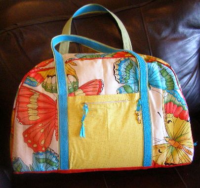 The Stash contained a beautiful large butterfly print – it is silk and only 30″ wide! Silk with a white background is not a great choice for luggage – so some red ultra-suede-esque fabric was used for the base.