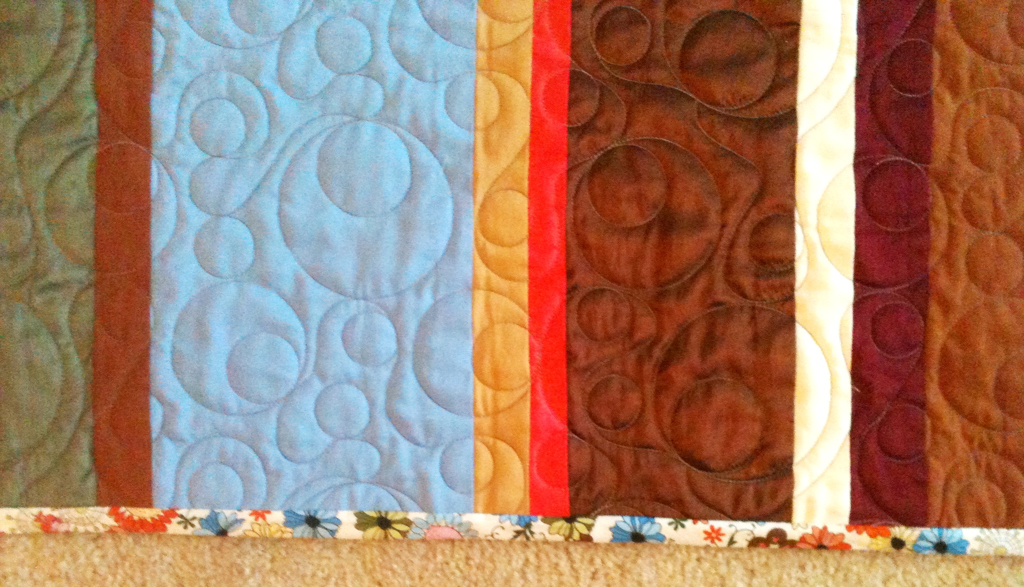 To counter the sharpness of the stripes, a Bubble Pattern was chosen for the quilting. I love the swirls (as evidenced by the swirls in the website header!)