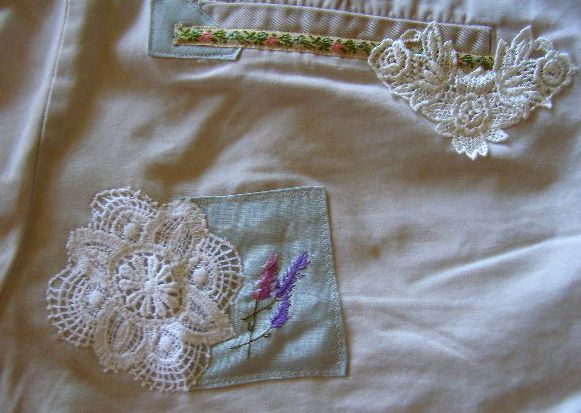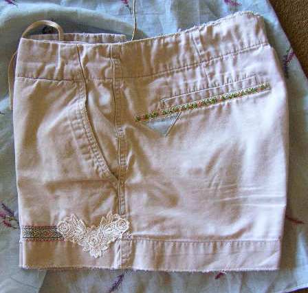 Linen was selected as the patching of choice. Then a few ribbons and some lace from The Stash – and the shorts are good to go!