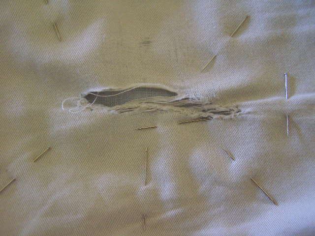 The worn lower edges of the legs were reinforced with zig-zag stitches so the hanging threads could be trimmed.