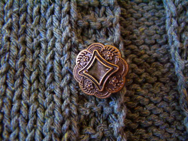 The cardigan closes with buttons from The Stash. The buttons are a copper metal with a glass diamond center. The glass in an olive green which coordinates nicely with the greens in the yarn.