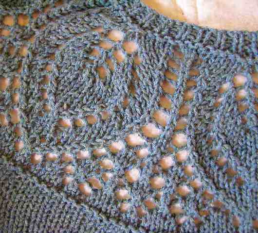 The pattern selected had a beautiful leaf lace yoke but was a sleeveless top knit in a much smaller gauge. Revising the yoke required much math and regraphing. The sleeves and body were estimated (and then knit, unraveled, re-estimated and knit again).