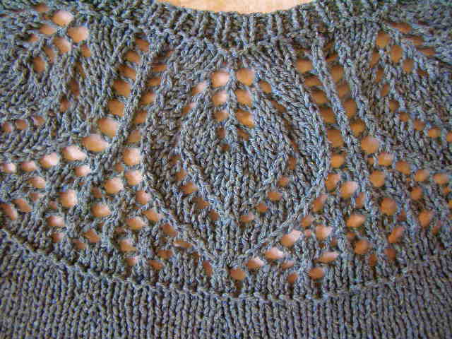 The yoke lace pattern is stunning even at this gauge (aran weight yarn and size 9 US needles).