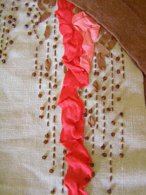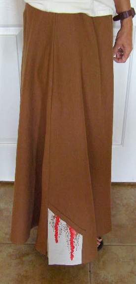 I selected the medium weight brown linen because it allowed me to use the beaded piece as the embellishment – and wouldn’t you know – it was EXACTLY the length to allow me to cut out the skirt!
