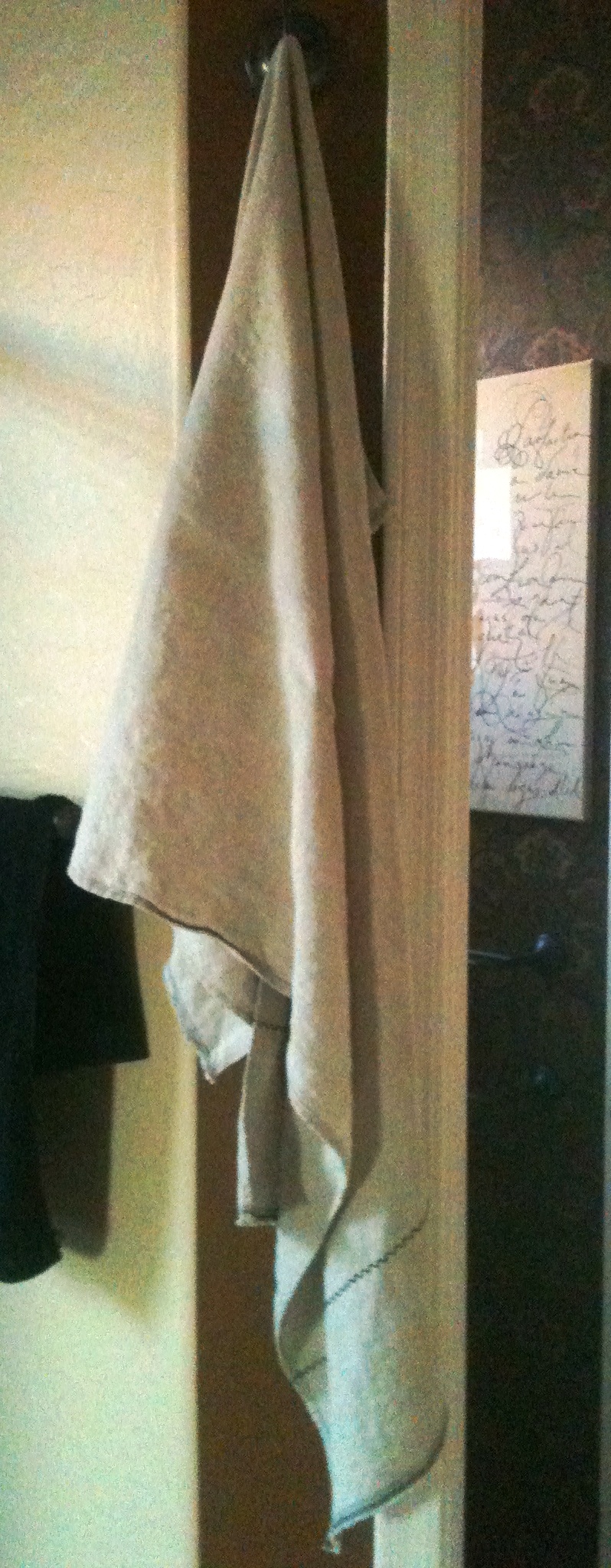 The SLS provided a few options, but in keeping with the muted tones of those towels available commercially, a 1.75 yard =/- remnant of raw 100% upholstery weight linen was selected and then washed in hot water – twice.