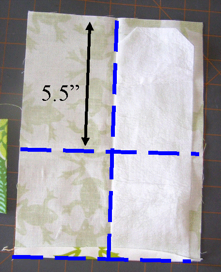 2. Iron fabric rectangle flat, then fold in half lengthwise and press (this will be referred to as the “Center Line”). Then open and fold along line 5.5″ from one of the narrower ends. Press again (this will be referred to as the “5.5″ Line”). Open and fold up 1/2″ from other narrow end. Press again. Place interfacing piece, fusible side down, against center fold line and 1/2″ bottom fold line. Fold lines and interfacing placement are shown in Photo 3. Fuse interfacing to fabric.