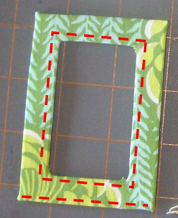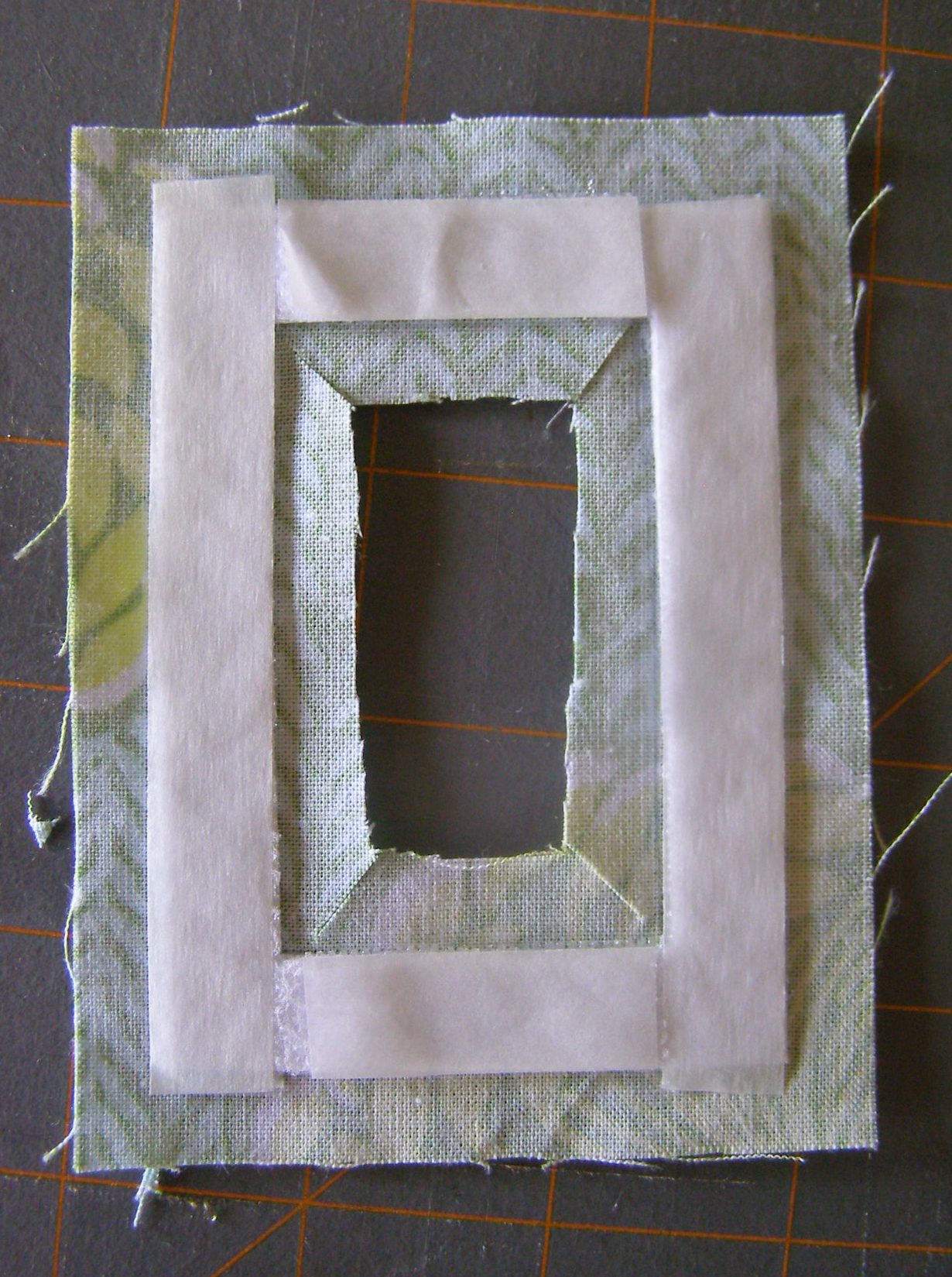 5. Carefully, or using an already-bearing-pieces-of-fusible-webbing-iron-from-earlier-mistakes like I do, fuse corners and inner fabric to RSS frame as shown in Photo 5. Then fuse outer edges.