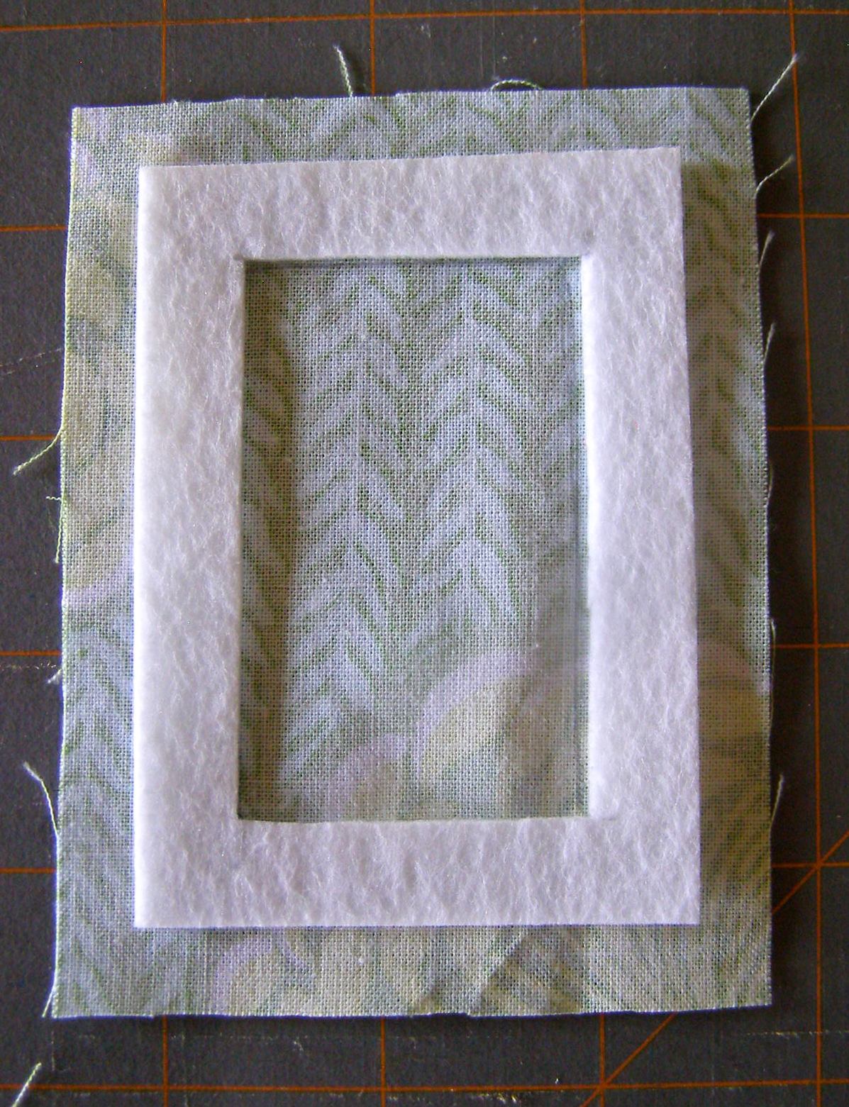 3. Following manufacturer’s instructions iron the fusible webbing to one side of the RSS frame. Then center and iron it to the wrong side of smaller fabric rectangle as shown in Photo 3.