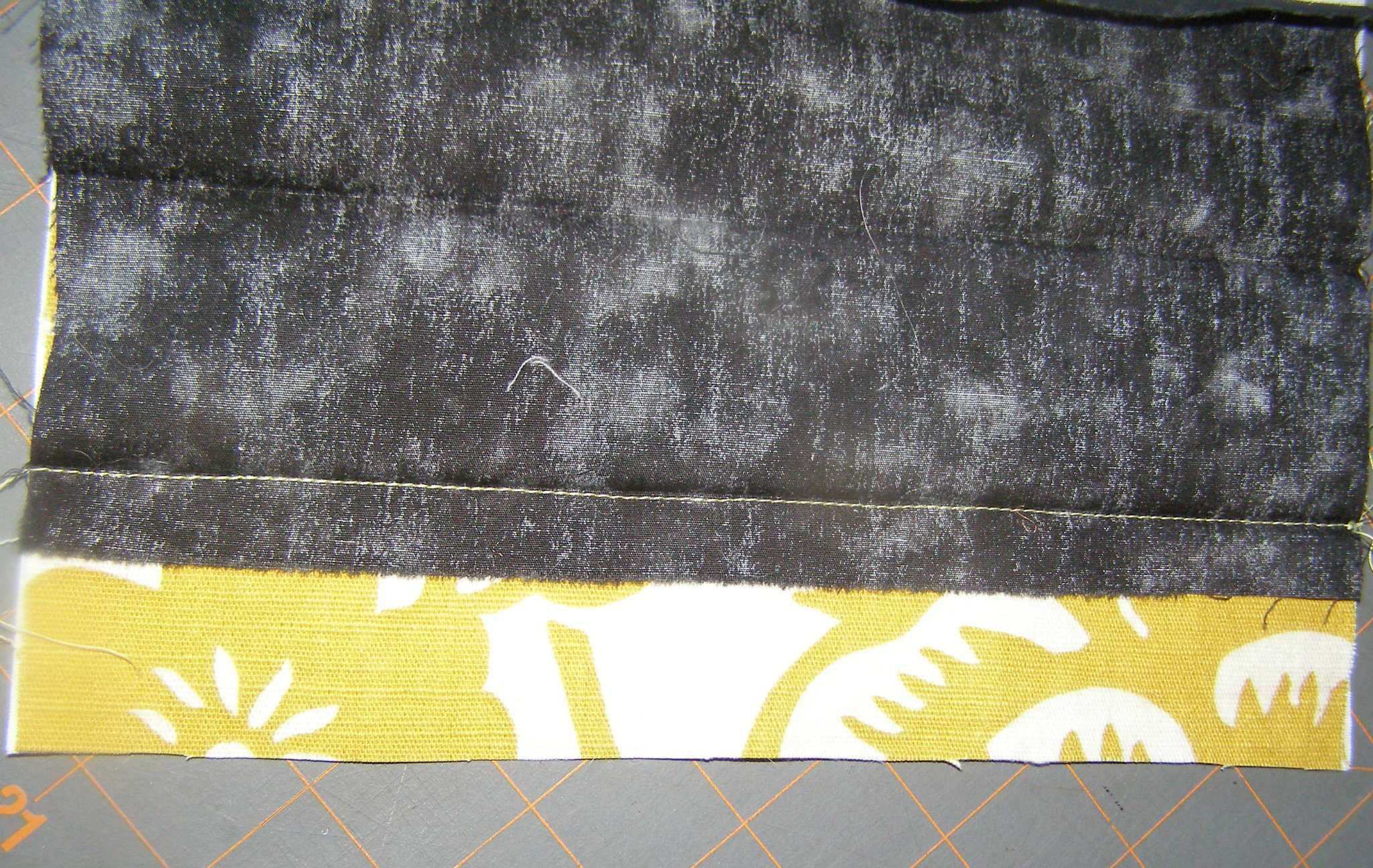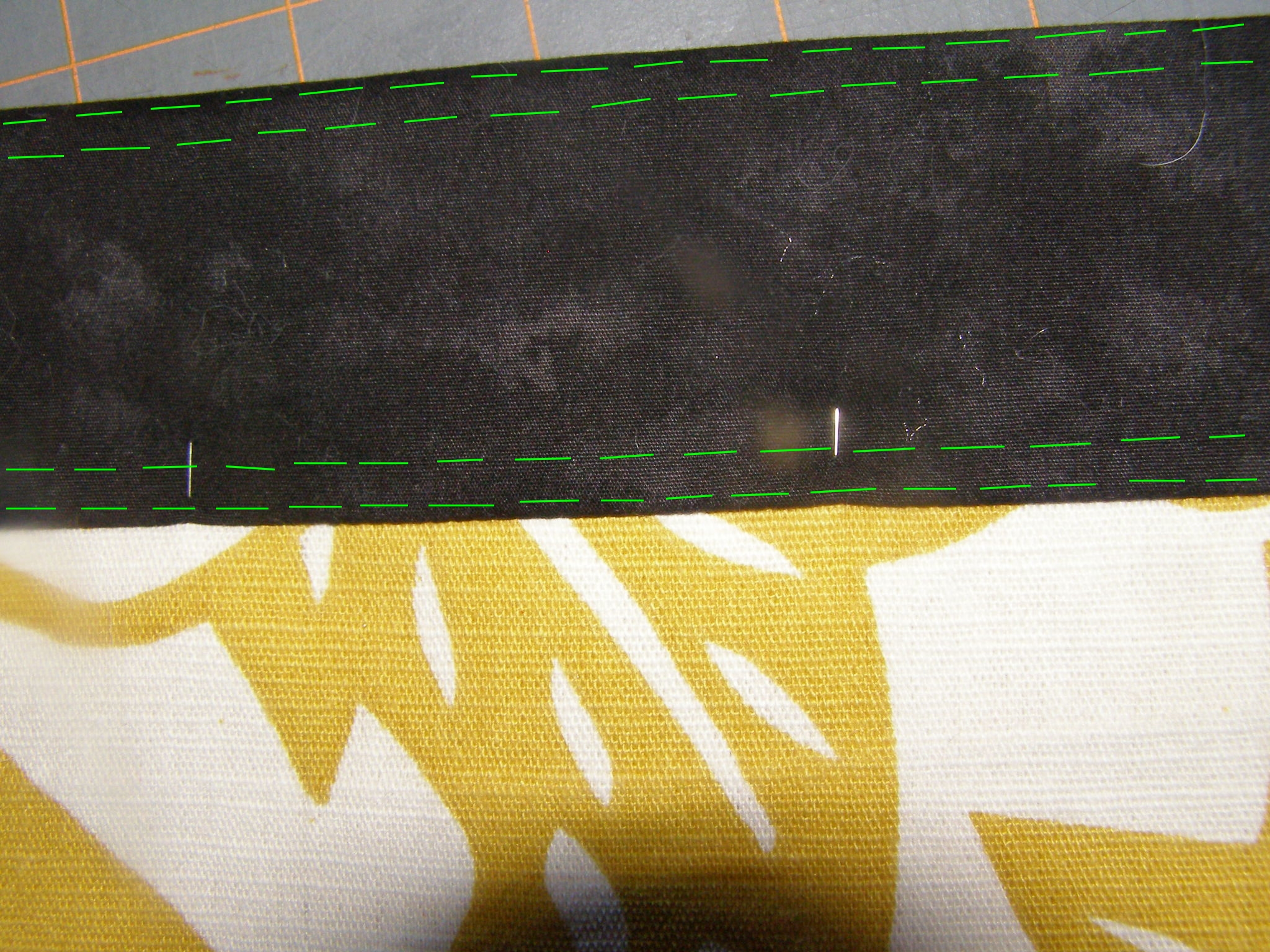 Topstitch upper and lower edges of darker fabric. Topstitch again 1/4′ from first topstiched lines.