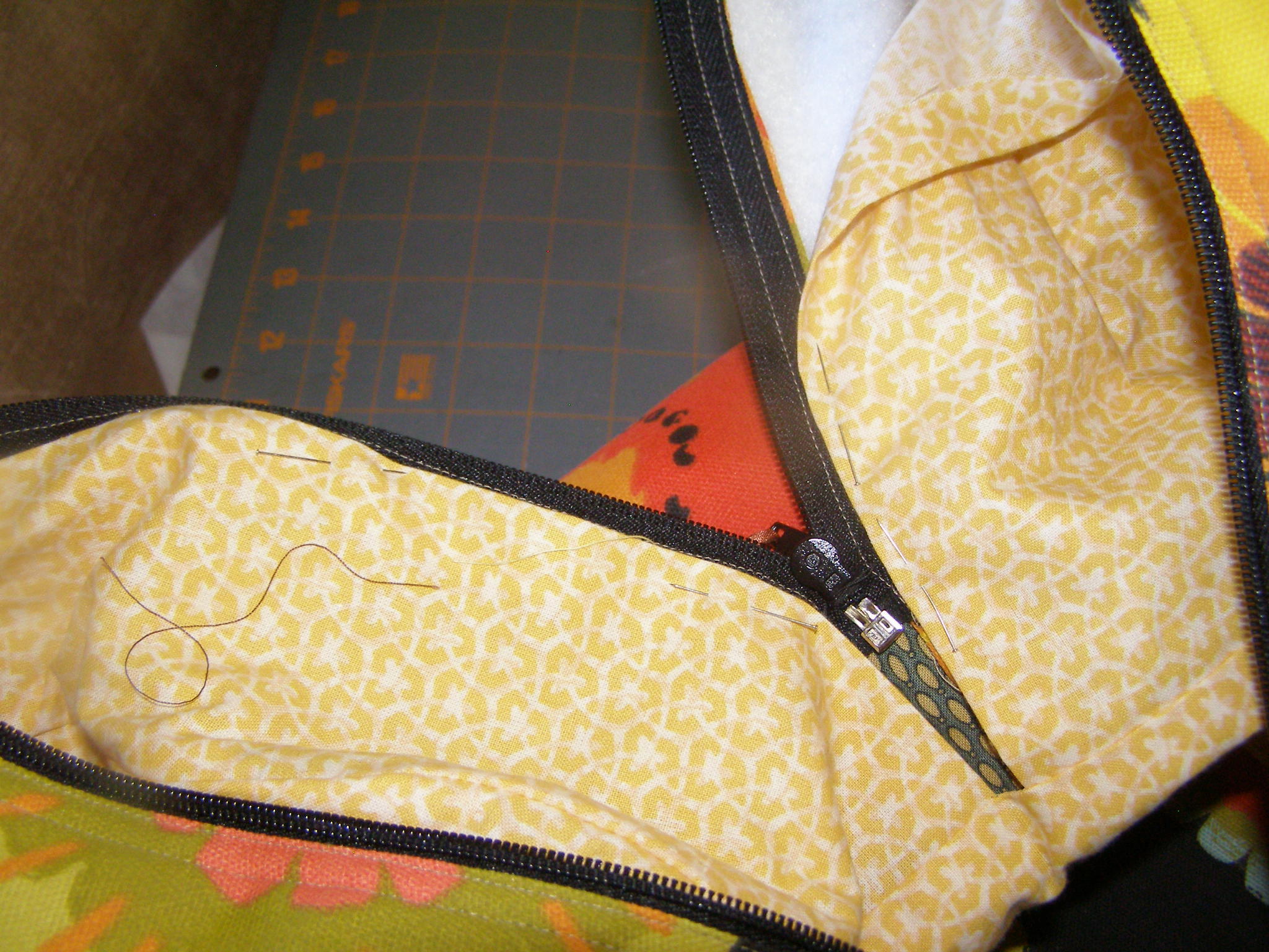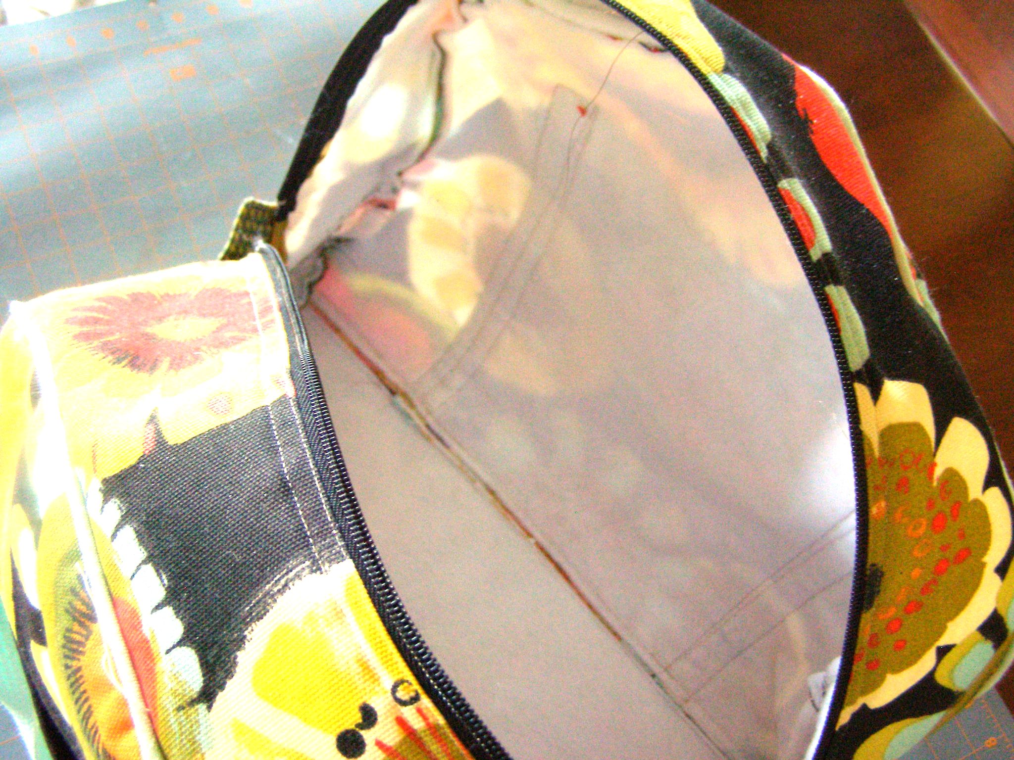Holding onto both the lining and the Outer Bag End/Base seams – pull them up through the zipper so they are are “free” and can be sewn.