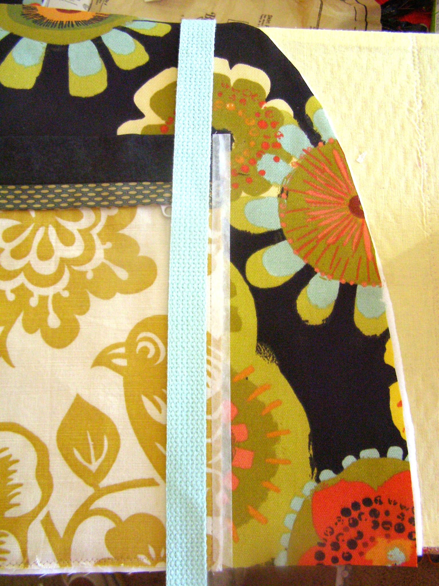 Fuse handles to Pocket side edges using fusible web (yes, another layer to the fusing sandwich). This fusing will prevent movement of handles while sewing.