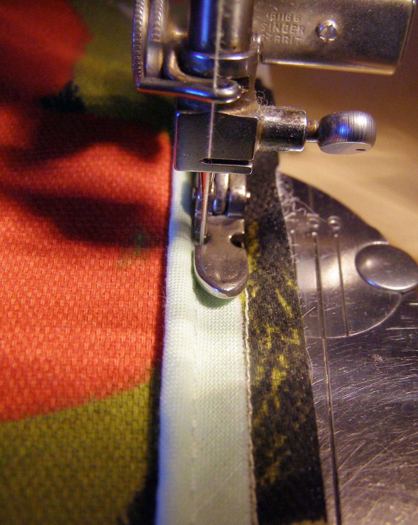 This stitching line will form a guideline for the piping. It also secures the not-always-100% fused-fusible-batting to the edges.