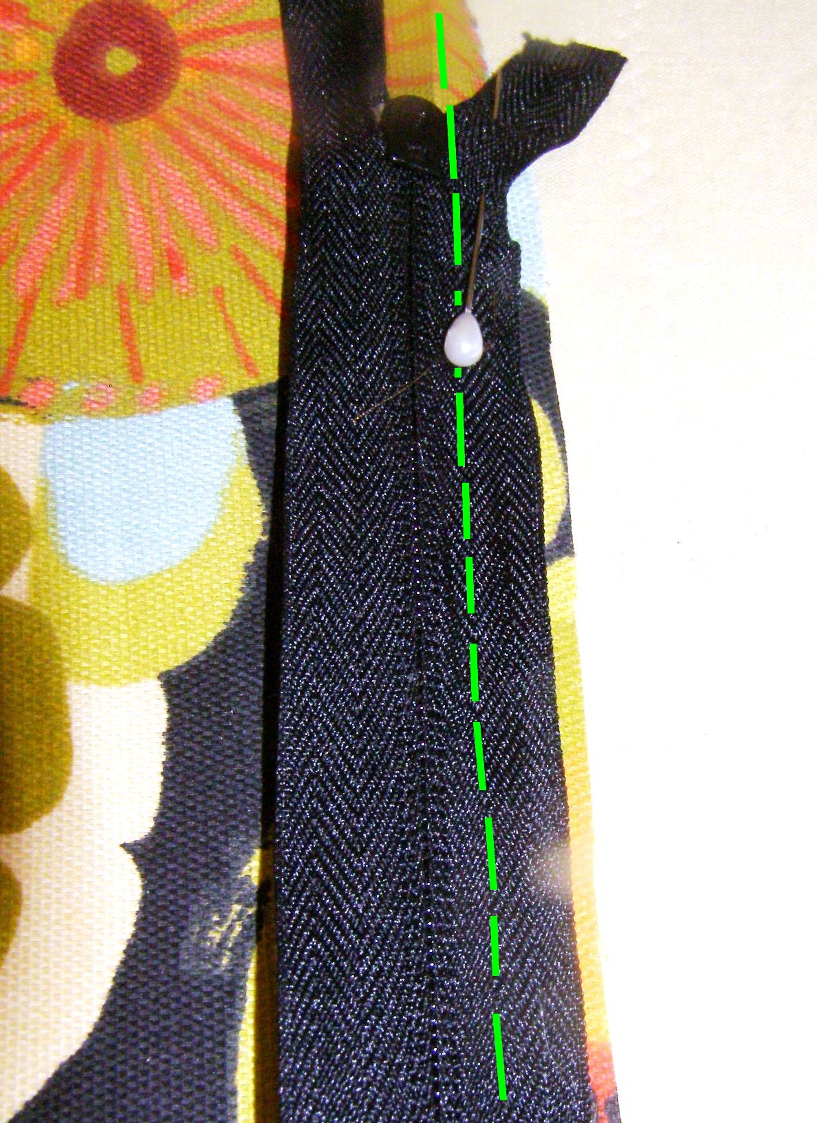 The photo does include an important step – if your zipper is a separating zipper (like a jacket zipper). Hand stitches are being taken close to the base of the zipper to prevent it from “unzipping” all the way – and separating. If using a purse or upholstery zippers – which do not separate – this step is not required.