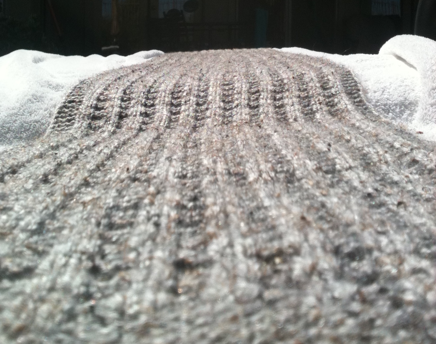 The Yarn Stash contained a few skeins of a worsted weight marled acrylic yarn. Not being an acrylic knitter, I cannot explain this yarn being in The Stash. But this Grey Marble Vanna’s Choice, met the (lack of color) color requirements – and became surprisingly soft after blocking.