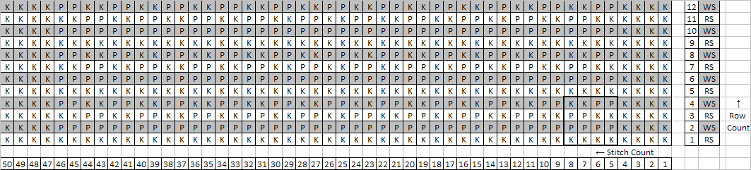 In the above chart, K = Knit and P = Purl.  The first 12 rows of the Waffle Pattern section of the scarf has been charted.  Wrong Side (WS) rows are shaded.