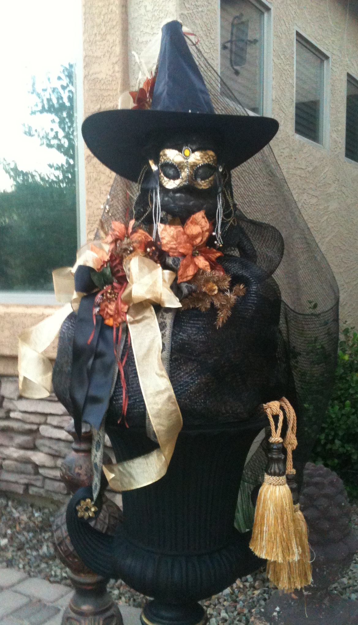 To create the witch, three purchases totaling less than $10 were required: A witch hat, a mask and a roll of black nylon netting.