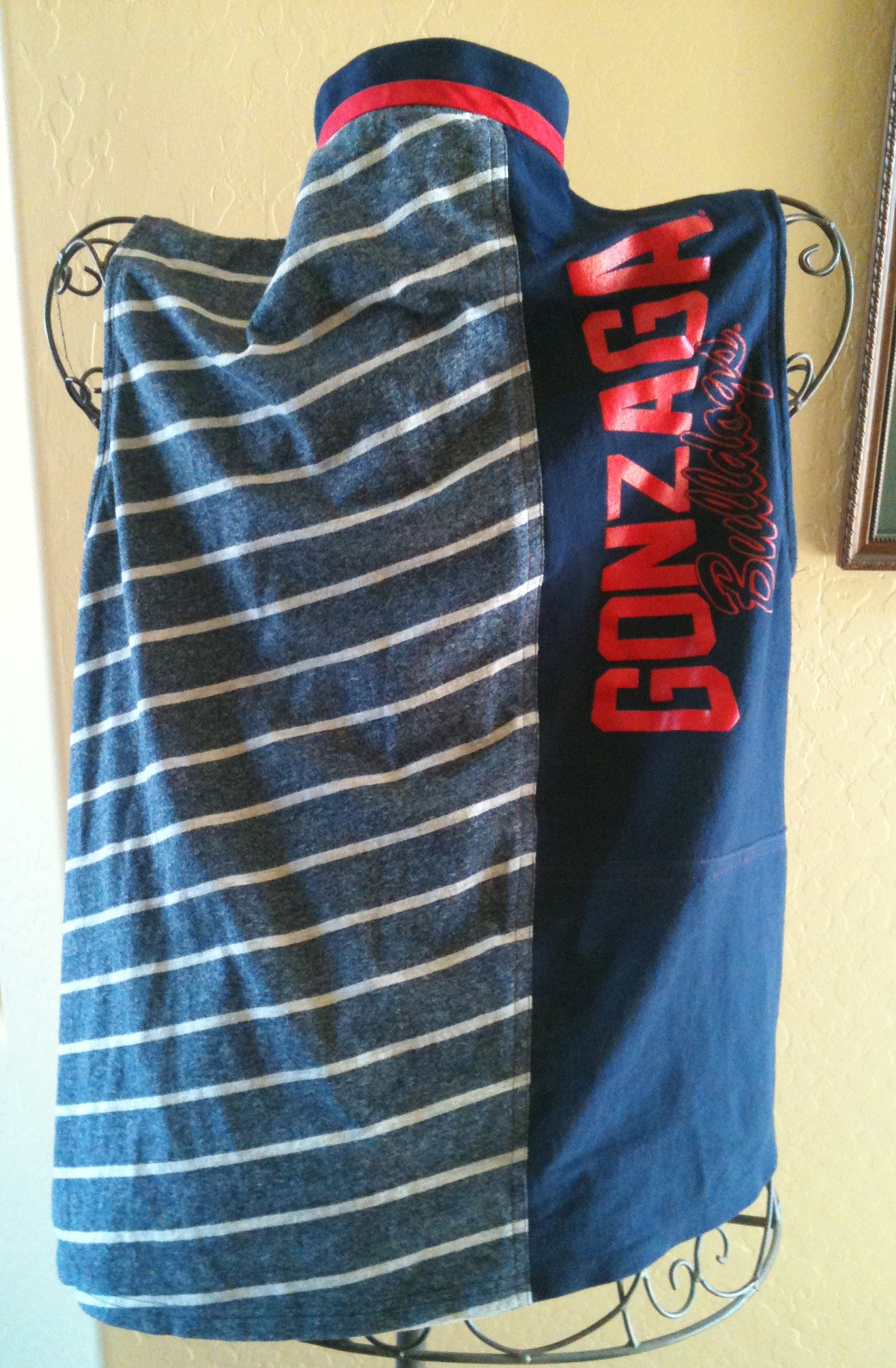 The logo and collar were cut from the same navy logo T-shirt. In keeping with the T-shirt remake theme, the stripe was cut from two men’s XL V-neck T-shirts. The front facings were cut from a grey T-shirt.