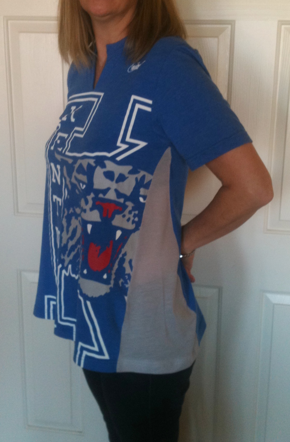 Easy to sew – just cut t-shirt along side seams. Sew in triangular fabric pieces.