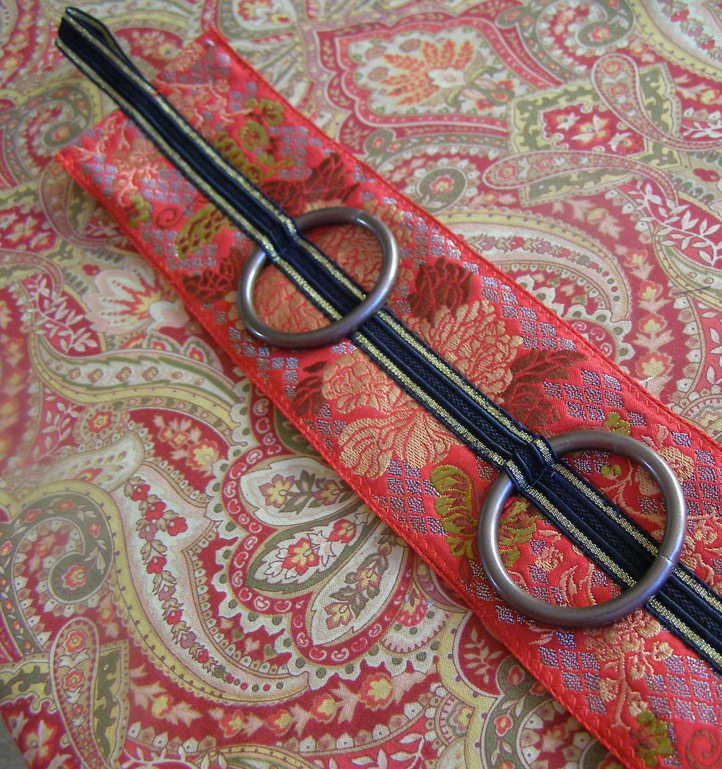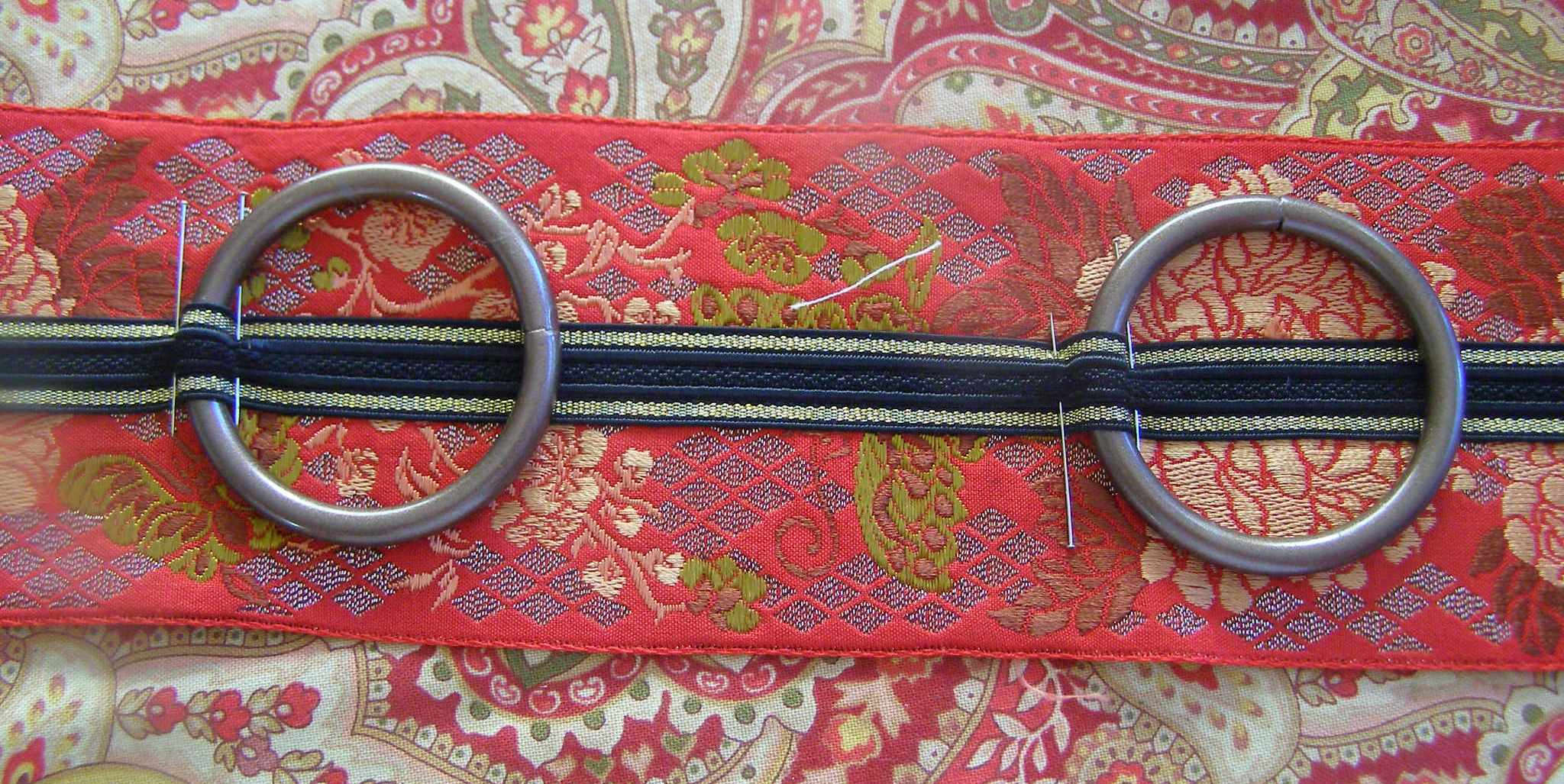 Take to sewing machine. Using zipper foot, sew back and forth across narrow ribbon as close to rings as possible to secure.